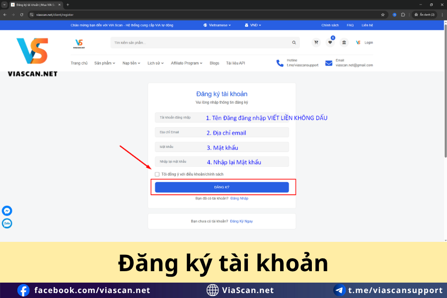- Đầu tiền bạn truy cập vào link đăng ký sau: https://viascan.net/client/register